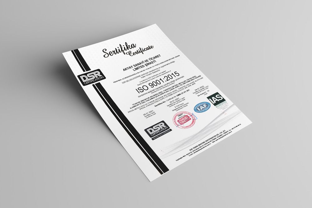 AKYAY, который хочет наилучшим образом оправдать ожидания клиентов, может отслеживать удовлетворенность клиентов, создавать структуру, которая уделяет внимание применению и производительности, а не документации, поддерживает общие принципы системы управления и облегчает интеграцию систем управления, мыслить на основе рисков, брать за основу процессный подход, их можно измерить на каждой единице и уровне. перешла на систему управления качеством ISO 9001: 2015 с 5 января 2021 года, чтобы обеспечить определение целевых показателей качества и планирования качества, которые обеспечат постоянное улучшение для достижения целевых показателей качества, и была сертифицирована DSR TEKNIK MUAYENE AKREDITASYON.